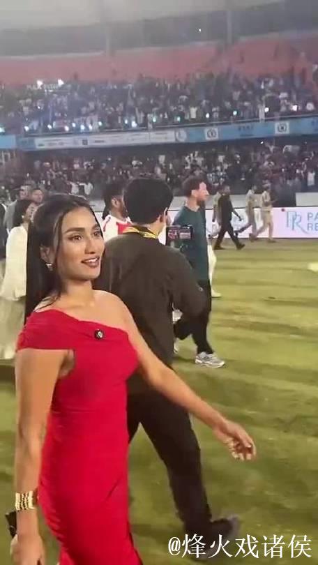 在这个充满话题性的绿茵之夜,镜头给出的第一个完整长焦画面,并不是球门、不是教练席,而是一袭红裙——一位来自印度的女主持,在聚光灯与闪光灯的交织下,挽着阿根廷球星、世界足坛标志性人物梅西,一同从球员通道...